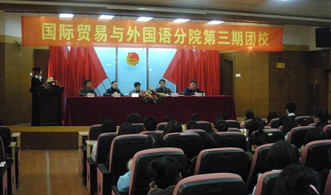 12月12日,国际贸易与外国语分院第三期团校暨团学干部培训开学典礼在一号楼三号报告厅隆重举行。国际贸易与外国语分院院长陈国龙,校团委副书记刘竞,分院团委书记陈文霞等老师,老一届的学生干部代表,以及180余名团校学员参加了本次开学典礼。