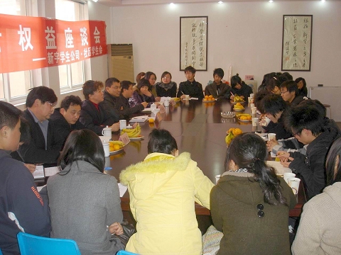 2009年以“消费•发展”为年主题,为更好地贯彻《消费者权益保护法》、《产品质量法》等法律法规,值此“3•15”国际消费者权益保护日来临之际,2009年3月13日下午,学生社区党总支联合新宇公司召开了“放心消费在新宇、满意服务伴您行”主题座谈会。学生社区党总支书记、新宇公司副总刘青春,餐饮中心杭州监控主管黄建军,餐饮和公寓中心负责人参加了座谈。