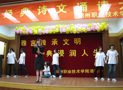 本次比赛经过层层选拔,晋级决赛的15组选手分别来自人文、国贸、工商、机电、建艺五个分院。选手们声情并茂地诵读了自己精心准备的作品,有伴舞的,多媒体音像伴奏的,最后人来自人文分院的於雅萍和建艺分院的过辰荣获一等奖,其他选手分获二、三等奖和优秀奖。此次大赛旨在弘扬民族优秀文化,推动校园文化建设和语言文字规范化工作,并为第二届浙江省大学生中华经典诗文诵读大赛输送作品。