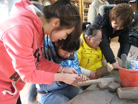 在陶艺坊里,志愿者们在学员旁耐心的手把手地教,手把手的做,使用各种器具对泥块进行敲、捏、刻、揉,发挥出学员们的想象,做出自己喜欢的作品,经过一个半小时的辅导制作,有的学员做了一双小手,有的做了一只杯子,大家都玩得不亦乐乎,在做陶过程中,志愿者们与学员们不断交流、沟通,了解他们的想法,潜移默化中教会了他们一些简单的陶艺制作方法。通过玩陶艺,这些孩子们没有了以前的拘束和胆怯,显得比之前更加从容,做陶玩陶也让孩子们在活动中发现,自己和普通人一样也有快乐的笑容、能干的双手、丰富的内心世界。