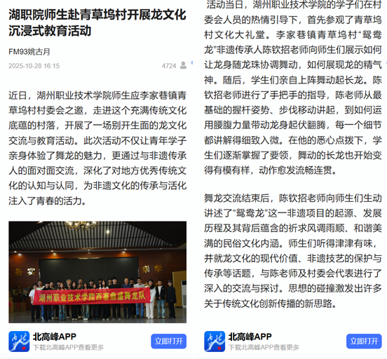2025年10月28日《北高峰》报道了我校艺术与时尚创意学院走进李家巷镇青草坞村开展龙文化交流与教育活动的相关新闻。