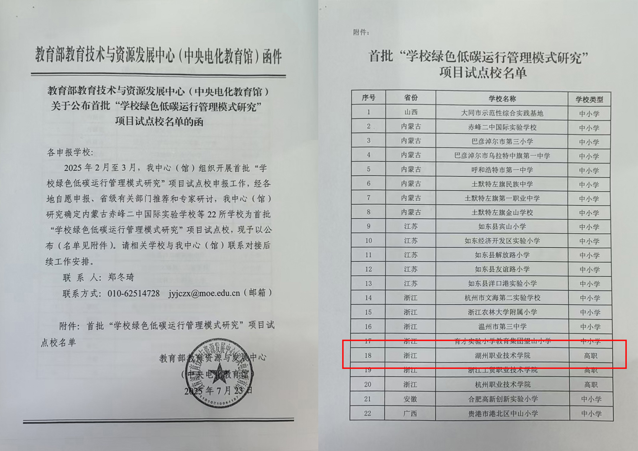 日前,接教育部教育技术与资源发展中心(中央电化教育馆)通知,学校入选全国首批“学校绿色低碳运行管理模式研究”项目试点校。